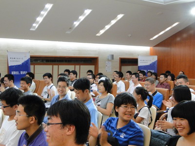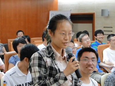 来自江苏南通中学的钱宇秋(1101)介绍了她选择中国科大数学系的经历,被恭喜她做出正确的选择“在科大,第一排永远是给女生准备的”。2010年江苏省理科高考第一名、钱宇秋的中学校友毛仕卓也被中国科大录取。在现场的沈浩(837,北京博飞电子科技有限公司总经理)介绍“他父亲是我在科大同班同宿舍的同学,他父亲科大情节很深”。郑学忠(861,北京宝鱼银风科技有限公司总经理)向钱宇秋介绍了华罗庚创办的中国科大数学系的光辉历程。郑学忠7月曾回校出席86级校友20周年聚会与数学系教授们见面,他热烈欢迎这位小师妹的加盟。他还调侃“我们班三个女生,全部嫁给了科大男生。”