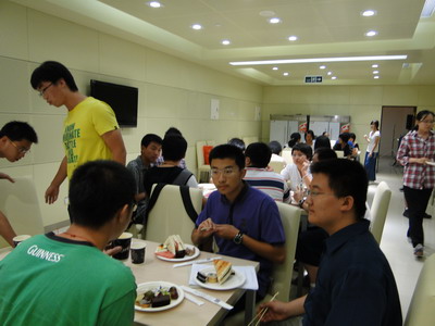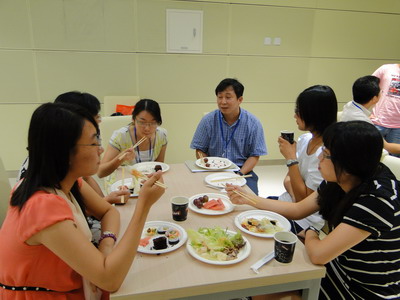 在座谈会环节之后,中国科大北京校友会与新创基金会在中国科学院科技政策所餐厅设冷餐会款待并欢送一周之后即将背负行囊向南、前往中国科大开学的2011级新生。这也是中国科学院科技政策所首次启用其全新的师生餐厅。校友与毕业生嘉宾与新生们围坐在一起,亲切交谈。熊辉教授和新生、家长们介绍科大的特色;而童晓航则找到现场唯一的一位生命学院新生,他游说同桌其余新生“你们应该转到生命学院去”。不过有人发现“晓航就知道忽悠女孩,他这一桌剩下没有一位男生”,而柏文洁(0319)身边围坐的是清一色的科大新生。这种现象被总结为“师兄喜欢帮师妹;师姐喜欢帮师弟”。谭明慧(0810)热心的给她人民大学师弟们好几位师姐的电话“我认为她们是没法拒绝师弟的。”