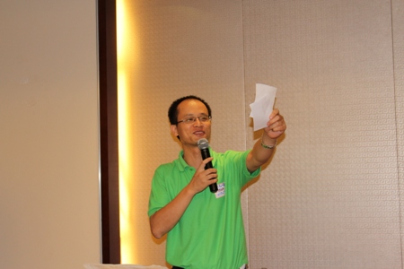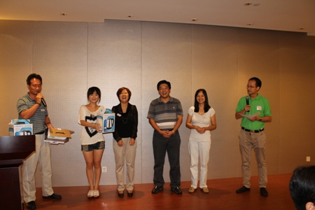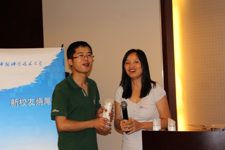 校友晚宴向校友们现场赠送了数千元礼品——抽奖环节跌宕起伏,颇为有趣。晚宴的首长级嘉宾(刘佩华与廖涛)全部中弹。正待抽奖时贝昂科技总裁冉宏宇博士(905)姗姗来迟。这位苏州工业园科技领军人才、2010年江苏省“双创计划”入选者是空气净化专家,他被罚担任第一位抽奖嘉宾。首先颁发的恶搞奖是黄色拖鞋与酱油——黄拖鞋、富光杯与T恤被认为是中国科大WSN(猥琐男)的典型特征。孰料,一位无辜女孩中枪抽中黄色拖鞋。晚宴礼物还包括两瓶酱油。“三号首长”廖涛副市长不幸被开涮成为第一位获奖者。廖涛自嘲“我本来就是(外地)来打酱油的啊”。苏州华亿安防公司总经理支洪平(936)抽出的第二位“打酱油奖”是孟腾飞。自称不做饭的孟腾飞把酱油转手送给支洪平夫人曾琴芳(9316)。