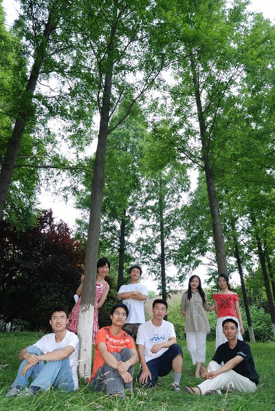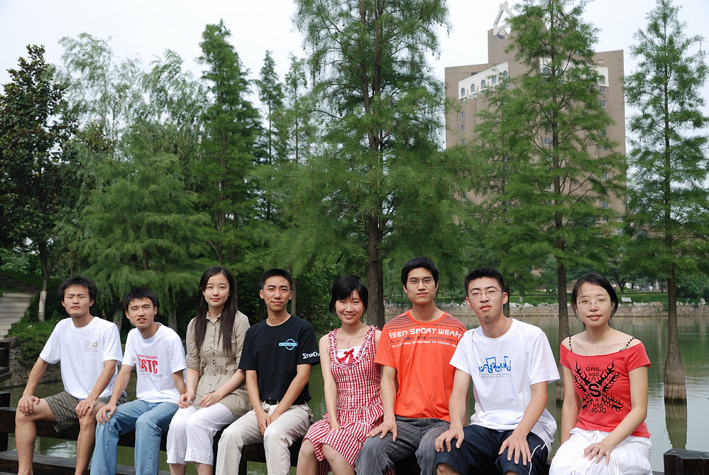 2008iGEM代表队队员摄于中国科大西区,该合影曾作为中国科大校友简报国庆特刊候选封面——因为队员身后大树象征着生机与希望。图中右三为沈贺。