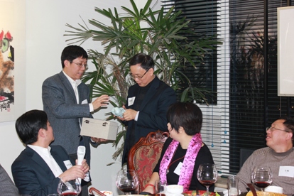 罗群(8611,中关村科技软件有限公司总裁)向侯建国赠送公司的镇纸纪念品作为新年礼物,他称,母校教育是校友事业成功的基础。