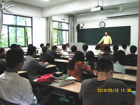 30多名爱心社成员在二教2204教室见面,傅乐民学长则从机场直奔教室,座谈会在十一点半准时开始。