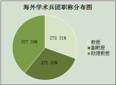 海外学术兵团以大学助理教授或以上学者数据为主,据统计,本项有效数据总人数919人,其中助理教授以357人位居第一,占总数的39%,副教授和教授各有275、278人。详情见下图。