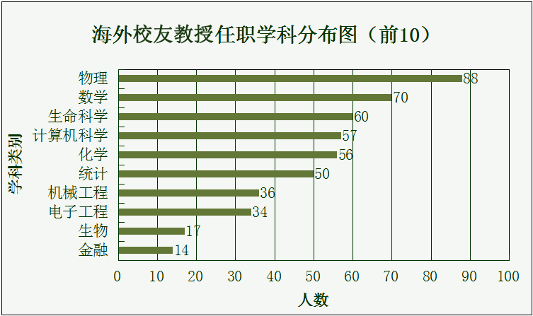 中国科大以科学技术类专业著称,本次调查数据显示,海外学术校友们,在各高院校就职的学科主要分布于物理,数学,生命科学以及计算机科学。位居十数据见下表,同时,统计类,工程类以及金融经济,甚至心理学、中国语言学、刑事司法科类(中国科大并未设此学科),都是中国科大校友有所涉及的学术学科。而亦有几十位校友担任医学相关学科教授。详情见下图。