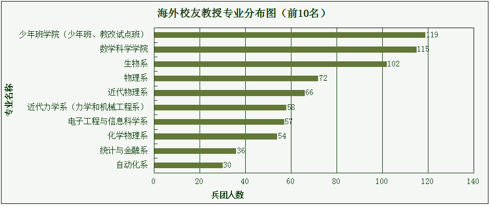 中国科学技术大学少年班一直是科大的明星院系,培养质量堪称中国第一院系。本次数据统计结果发现,海外学术兵团中,毕业于少年班学院的校友占17%,共计119人,而数学科学学院的校友人数以115人位居第二,占16%,第三名生物系,与任职学科分布情况中,物理学科位居第一的调查结果较一致。详情见下图。