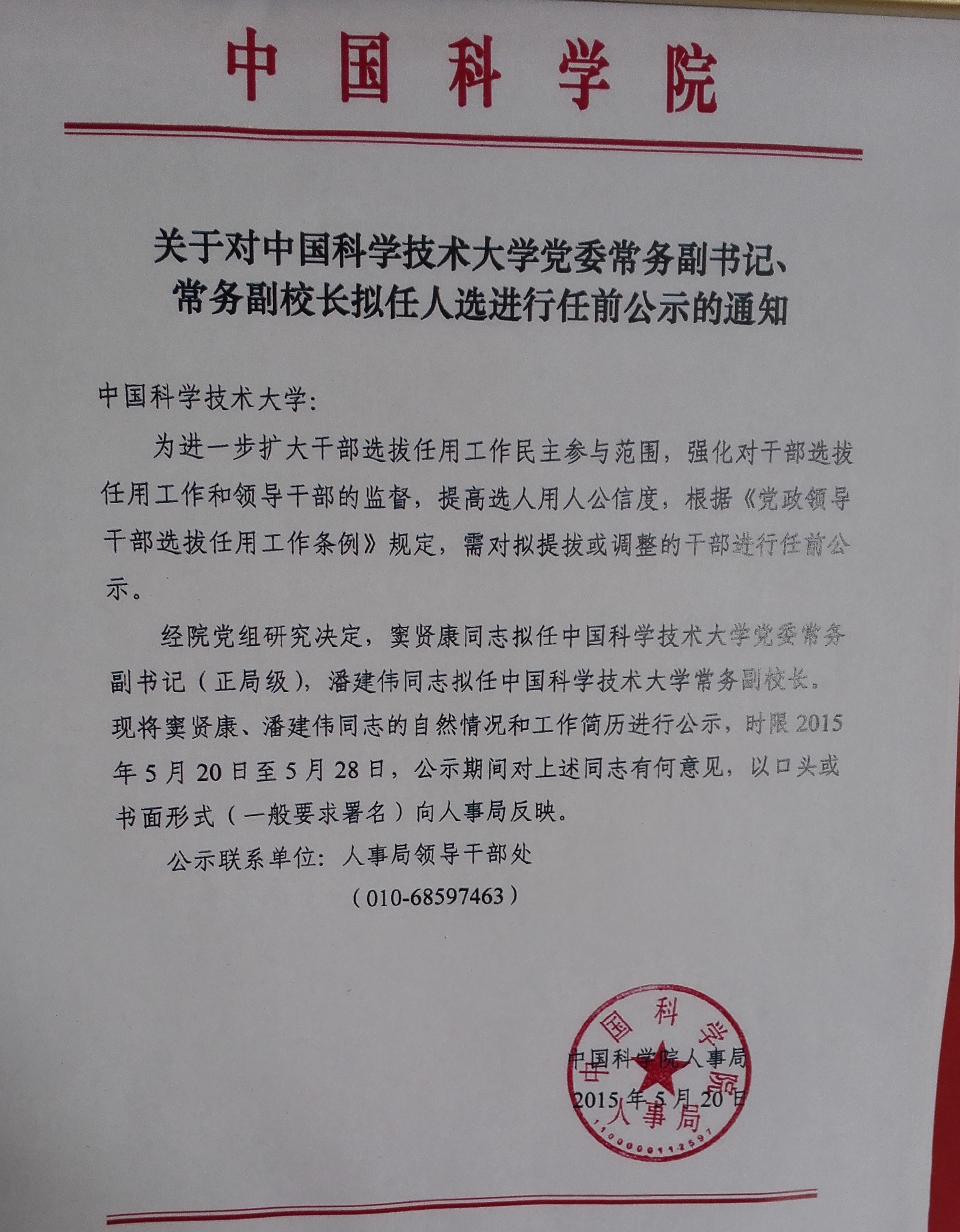 据传,中国科大校领导将再调整,窦贤康、潘建伟将分别出任党委常务副书记与常务副校长。以下为5月23日上午9:20一校友在东区行政办公楼用手机拍摄了的《关于对中国科学技术大学党委常务副书记、常务副校长拟任人选进行人选公示的通知》。