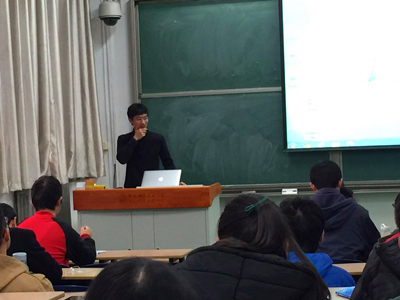 徐薛胤首先进行讲座,他从介绍美菜网开始,讲述了美菜网的营业内容、发展历史、管理方式和社会责任等。