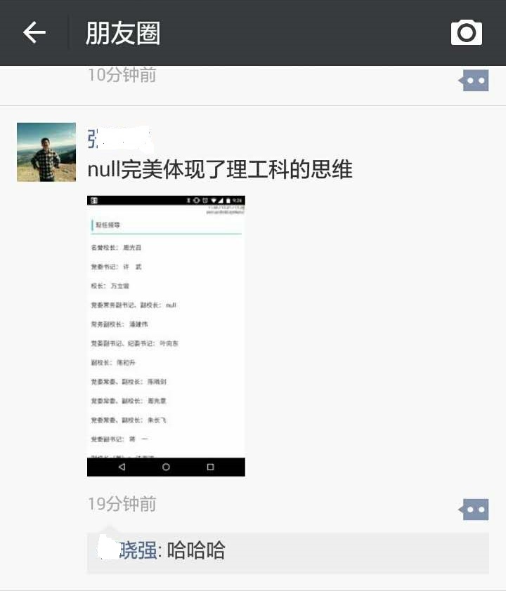 null是目前中国科大现任校领导中唯一的信息科学背景人士,意义重大。12月29日上午,某9211校友突然在微信朋友圈晒出一张贴出截图,祝贺null出任新职,并调侃“null完美体现了理工科的思维”。