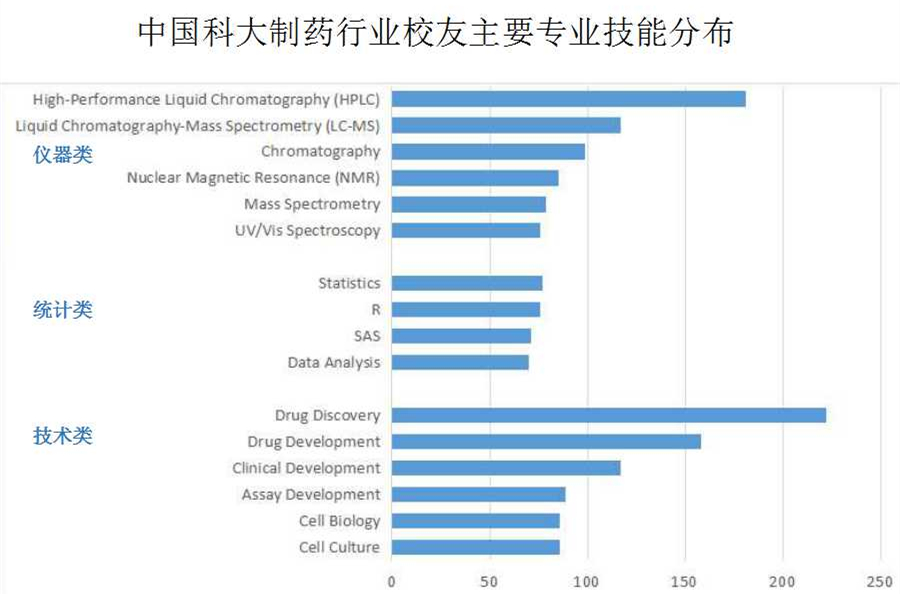 其次,由于LinkedIn数据的特点,在分析制药与生物技术行业校友的专业背景与技能分布时,若限定了“Biotechnology”、“Pharmaceuticals”行业校友则无法分析这些校友的专业背景与技能情况,因此在分析制药与生物技术行业校友的专业背景与技能分布时,只能以“Biotechnology”、“Pharmaceuticals”、“Pharmaceutical”为关键词进行搜索,并对搜索结果进行统计分析。此点亦提请校友注意。