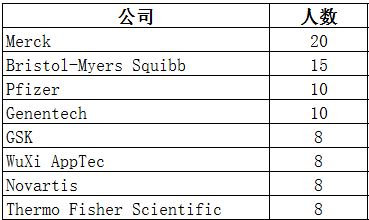 根据LinkedIn上数据,化学学科背景校友就业人数排名前八的制药及生物技术类公司如下:
