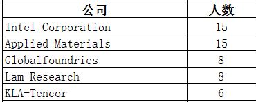在半导体行业中,校友分布较为集中的公司有Intel Corporation(15位)、Applied Materials(15位)、GlobalFoundries(8位)、Lam Research(8位)及KLA-Tencor(6位)等。