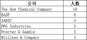 其中校友分布较为集中的公司有:The Dow Chemical Company(19位)、BASF(8位)、SABIC(5位)、PPG Industries(5位)、Procter & Gamble(3位)、Milliken & Company(3位)等。