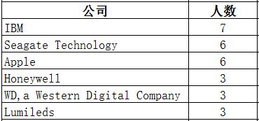 3.计算机硬件或电子制造业中,校友分布较为集中的公司有IBM(7位)、Seagate Technology(6位)、Apple(6位),Honeywell(3位),Western Digital Company(3位),Lumileds(3位)等。