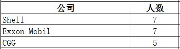 化学学科背景校友分布较为集中的能源公司有Shell(7位),Exxon Mobile(7位),CGG(5位)等。