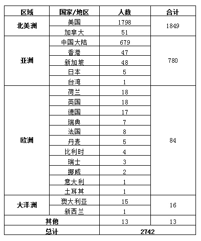 在美国的校友有1798人,占全部人数的65.57%;在中国(含港澳台)的校友727人,占26.51%;在欧洲的校友84人,占3.06%;在加拿大的校友51人,占1.86%;在新加坡校友47人,占1.71%;在其他地区校友较集中的地区为澳大利亚、日本。
