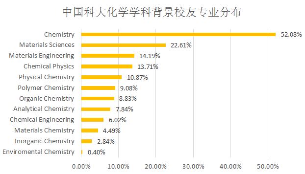 如2742位校友中有1428人有Chemistry专业背景,占总数的52.08%,620人具有Material Sciences或Material Science专业背景,占总数22.61%,这几个人群可能出现重叠。在以下统计分析中,为Material Sciences或Material Science专业背景统一为Material Sciences。