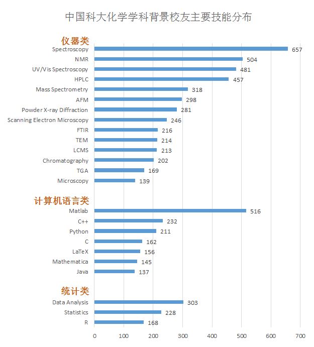 在本次调查中,化学学科背景校友的技能主要涉及到仪器类、计算机类与统计类。其中仪器类技能主要有光谱学(Spectroscopy)、紫外—可见分光光度法(Ultraviolet–visible spectroscopy)等;计算机类技能主要有Matlab、Microsoft Office等。