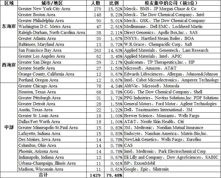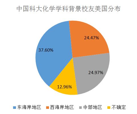 在美国化学学科背景的校友,在东海岸主要分布在Greater New York City Area(279位),Greater Boston Area(148位),Greater Philadelphia Area(90位),Washington DC Metro Area(47位;在西海岸主要分布在San Francisco Bay Area(263位),Greater Los Angeles Area(62位),Greater San Diego Area(39位);在中部地区主要集中在Greater Chicago Area(78位),Houston, Texas Area(68位),Greater Detroit Area(28位)。