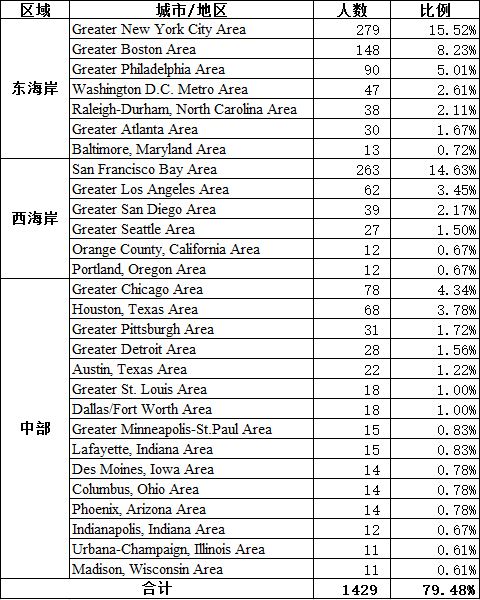 下表列出了LinkedIn上化学学科背景校友超过10位的城市/地区及校友数量: