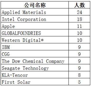 根据新创基金会和LinkedIn数据,中国科大纳米技术行业校友集中的公司有:Applied Materials,Intel,Apple,CGG,GLOBALFOUNDRIES,Seagate Technology,IBM,The Dow Chemical Company等。具体见下表: