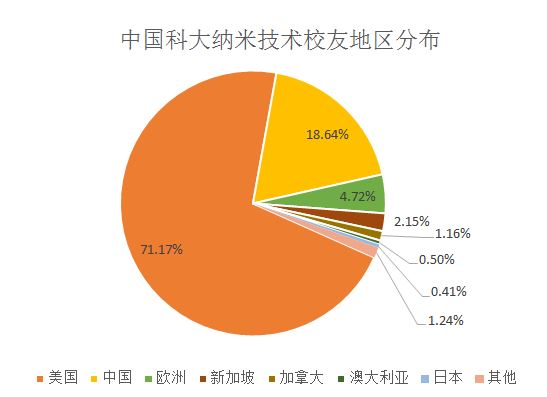 根据LinkedIn数据,纳米技术行业在美国的校友有859人,占全部人数的71.17%;在中国(含港澳台)的校友727人,占18.64%;在欧洲的校友57人,占4.72%;在新加坡校友26人,占2.15%;在加拿大的校友14人,占1.16%;在其他地区校友较集中的地区为澳大利亚、日本。