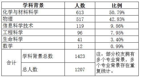 若校友拥有多个专业背景,则多个专业背景重复统计。如,1207位校友中有613人拥有化学与材料科学背景,占纳米行业校友总数的50.79%;拥有物理专业背景的校友占总数的42.83%。这二个人群可能出现重叠。