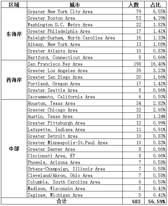 从上表可以看出纳米技术行业校友在美国的几个分布特点: