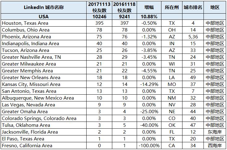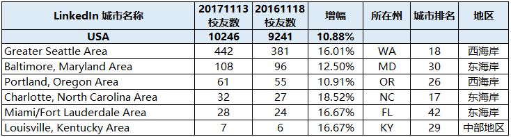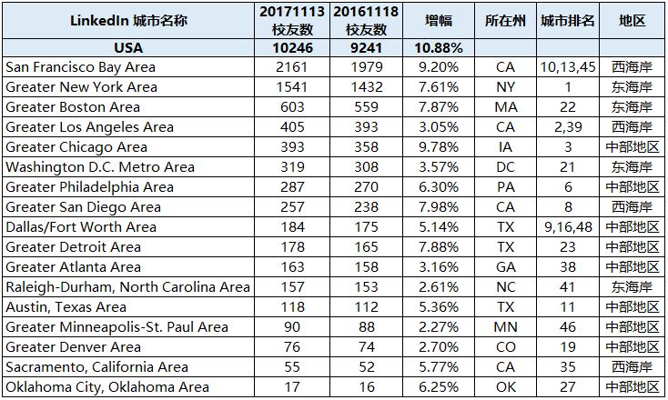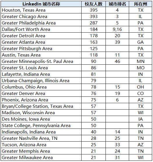 在LinkedIn上注册超过50位的城市/地区有33个,其中西海岸有7个,校友3497位,东海岸有8个,校友2903位,中部地区29个,校友2622位。