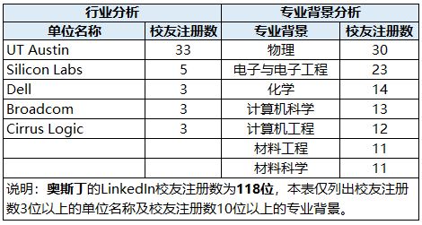 从上表可以看出,Univ. of Texas at Austin是奥斯汀校友的第一大集中单位,在奥斯汀工业界的校友较为分散,但可以看出主要集中在半导体(Silicone Lab、Circus Logic)、通信行业(Dell、Broadcomm)。点击这里查看新创基金会在2014年推出的Austin工业界校友分布调查。