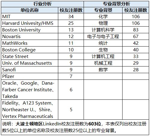 Greater Boston Area(大波士顿地区)指Boston-Cambridge-Newton都会区。该区域包括多所国际上声名卓著的大学和研究生院,其中最著名的当属哈佛大学、麻省理工学院、波士顿大学、波士顿学院、塔夫斯大学(Tufts University)、布兰迪斯大学(Brandeis University)等。LinkedIn上以上6所大学的校友有92位,占该地区校友总数的15%。除了高校外,中国科大校友在大波士顿地区集中的行业有生物医疗公司(如Novartis、Sanofi、Pfizer等)、科技公司(如MathWorks、Oracle、Google等)、金融公司(State Street、Fidelity等)。