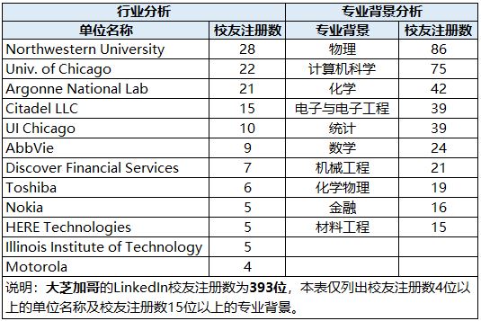 Chicago(芝加哥)地处北美大陆的中心地带,为美国最重要的铁路、航空枢纽,也是美国主要的金融、期货和商品交易中心之一,是美国仅次于纽约、洛杉矶的第三大都会区。大芝加哥地区校友集中的单位为高校/研究所(西北大学、芝加哥大学、Argonne国家实验室、伊利诺伊州立大学芝加哥分校)、金融机构(Citadel LLC、Discover Financial Services等)、生物医疗公司(AbbVie、TMRU等)、信息技术公司(Nokia、HERE Technologies、Motorola Mobility等)。