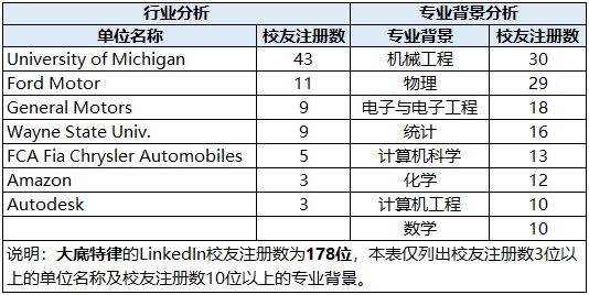 Detroit(底特律),别名“汽车之城”(the Motor City),位于美国中部,是美国密歇根州最大的城市。Greater Detroit Area包括Detroit市及Livonia、Ann Arbor、Southfield等周边城市。大底特律地区校友集中的行业为汽车行业(Ford Motors、General Motors、FCA Fia Chrysler Automobile等)与高校(Univ. of Michigan、Wayne State Univ.),此外已有校友供职于互联网公司(Amazon、Autodesk)、半导体公司(Marvell Semiconductor)等。