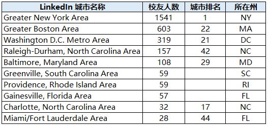 东海岸LinkedIn注册校友超过20位的城市: