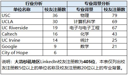 Greater Los Angeles Area(大洛杉矶地区)包括Los Angeles,及周边多个小城市与地区,如:Pasadena、Long Beach等。需要指出的是尽管UC Irvine位于Irvine,Orange County,但LinkedIn上UC Irvine校友将所属的地区列为Greater Los Angeles Area而不是Orange County。在大洛杉矶地区主要集中在各个高校,如USC、UCLA、UC Riverside、Caltech、UC Irvine,在工业界的校友集中在软件、信息技术、互联网公司,如Google。