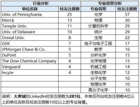 Philadelphia(费城)是全美最大的大学城(college town)之一,拥有许多高等学府,其中包括常春藤盟校的宾夕法尼亚大学、Temple University、Drexel University 均是校友集中的高校。费城校友集中的行业包括生物医疗健康行业(Merck、GSK、Incyte、Pfizer等)、金融行业(JP Morgan Chase & Co.、Vanguard等)、化工行业(DuPont、The Down Chemical Company等)。