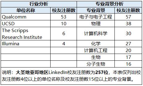 San Diego(圣地亚哥)是通信巨头高通公司(Qualcomm)总部所在地,Qualcomm是校友第一大集中的单位(53位),此外校友集中的通信行业公司有Huawei、HP、Broadcom、InterDigital等。圣地亚哥的生物制药工业也很发达,校友集中的单位有:Illumina(4位)、Thermo Fisher Scientific(3位)、Pfizer(2位)等。
