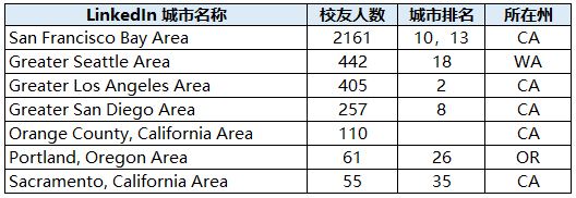 西海岸LinkedIn注册校友超过50位的城市/地区: