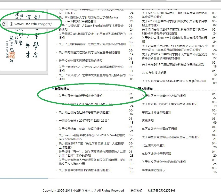 6月6日下班时分,中国科大官网(www.ustc.edu.cn)首页出现《关于召开全校教授干部大会的通知》。