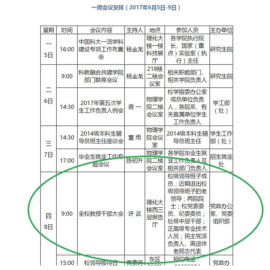 尽管前述通知指向incampus.ustc.edu.cn域名仅校园网内可见,但官网首页《一周会议安排》也清晰显示6月8日(周四)9:00召开“全校教授干部大会”,主持人许武,地点理化大楼西三层报告厅;参加人员为“校级领导班子成员;近期推出校级领导班子的老领导;两院院士;校党委委员、纪委委员;处级中层干部;正高级专业技术人员;民主党派负责人、离退休老同志代表”;主办单位“党政办公室、党委组织部。”前述各网页截图如下。以上中国科学技术大学新创校友基金会根据公开信息整理,不涉及内部信息。
