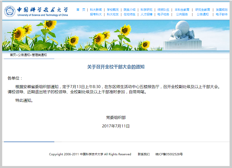 7月11日下午,中国科大官网(www.ustc.edu.cn)首页出现《关于召开全校干部大会的通知》。