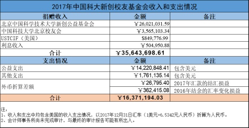 2017年,中国科学技术大学新创校友基金会(以下简称新创基金会)收到捐赠共计35,115,293.89元(人民币,下同),利息收入合计504,950.88元。新创基金会感谢校友对母校与新创基金会的支持。现践行财务公开原则,现向各捐赠校友通报2017年新创基金会捐赠收入及项目支出情况(尚未经审计)。