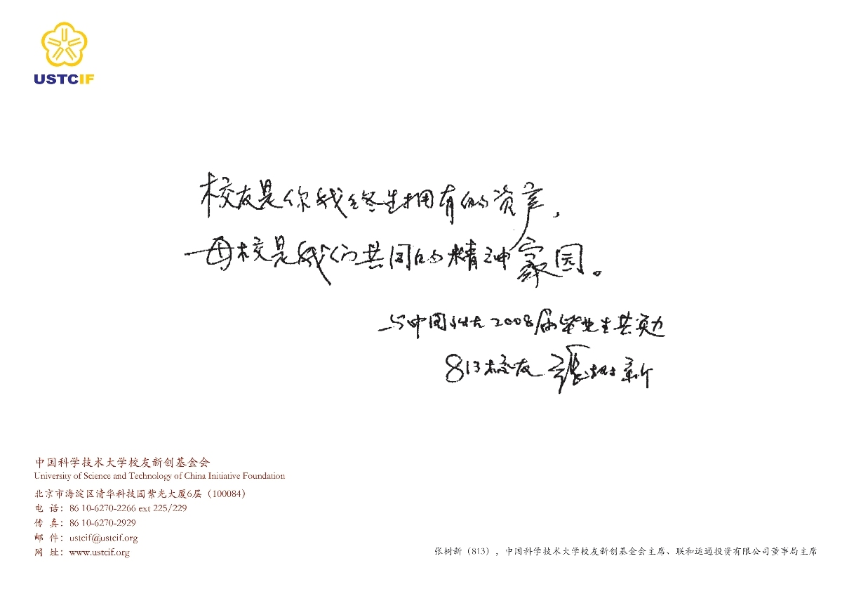 2008年7月3日毕业典礼现场,中国科大校友新创基金会向毕业生赠送了校友手写的签名贺卡,祝贺2008届毕业生学成。(由于时间紧张,未能将张云飞和林间校友的寄语加入贺卡中,将通过电子版向毕业生发送。)