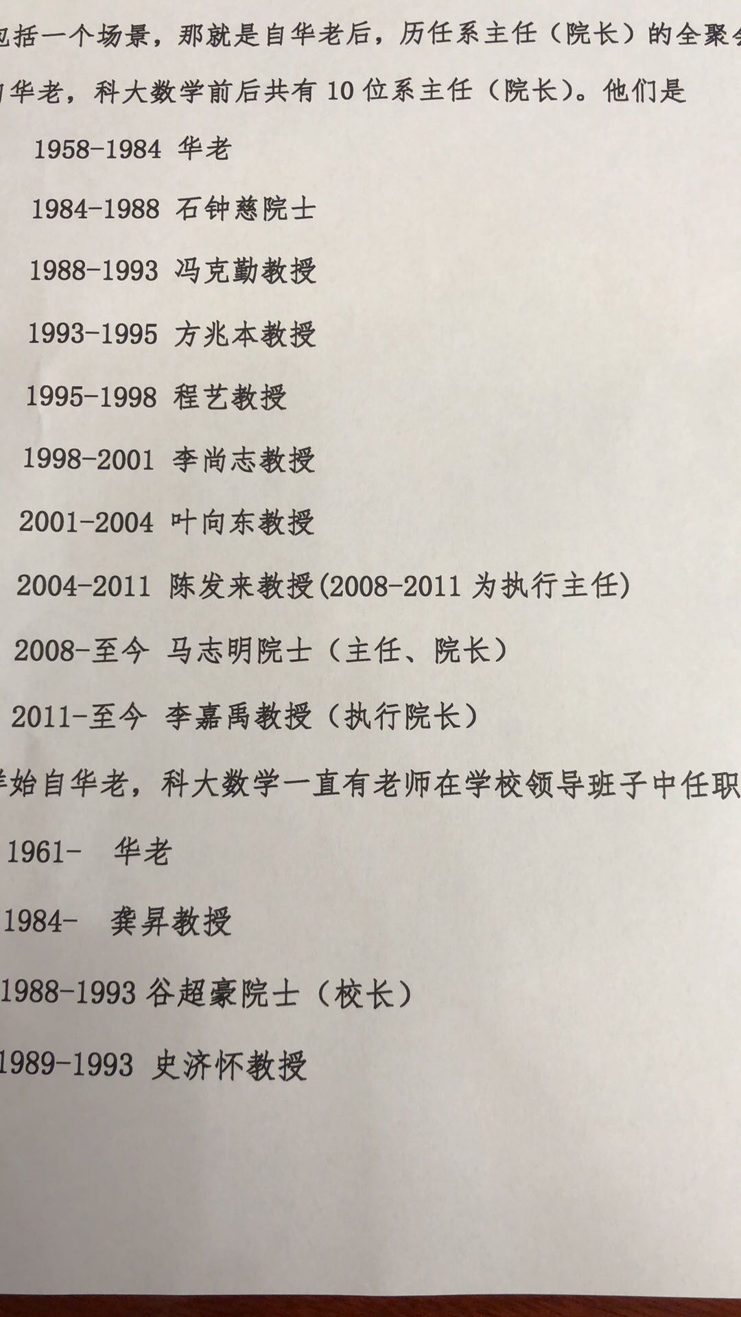 2018年9月20日下午,数学系十大系主任齐聚中国科学技术大学六十周年校庆现场,并拍摄了一张全家福。1958年中国科大数学系奠基以来,前后有10位系主任(院长)。据证实,这是史上首次系主任全聚首。60年前,华罗庚教授首创中国科大应用数学与计算技术系(时为11系,今数学学院与计算机学院前身)并亲任首任系主任。华罗庚教授也出席了2018年9月20日的数学系十大系主任聚会(如下图所示)。