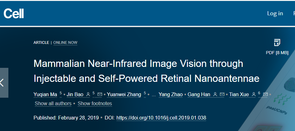 2019年2月27日晚23:30(北京时间),顶级期刊《CELL》杂志在线刊登中国科大生医部薛天教授的重磅论文。该论文是一篇关于视觉神经生物学与创新纳米技术的交叉成果。 论文与麻省大学医学院华裔科学家韩纲合作。