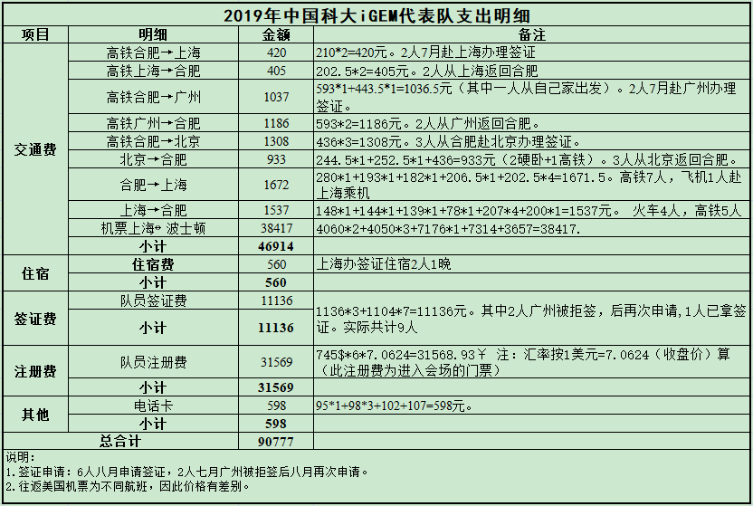 2019iGEM比赛落幕,中国科大夺得一金一银,。此次由新创基金会支出共计91,887元(人民币,下同),详细支出情况如下(由于部分财务票据尚在邮寄过程中,因此此表还由会计进行进一步审核,仅供参考)。新创基金会及iGEM全体队员向所有捐赠此项目的校友表示感谢。
