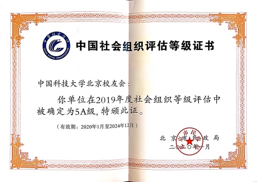 中国科大,北京第一!——2019年,中国科技大学北京校友会评估获评5A。!—— 2019年12月23日,北京市民政局公布的2019市级社会组织评估结果(京民社发〔2019〕193号)。中国科技大学北京校友会获评5A,成为当之无愧的北京市最佳高校校友会。