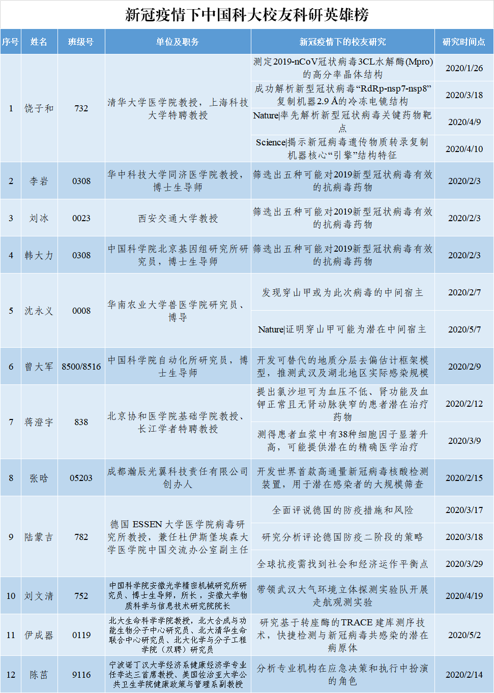 2020年,一场由COVID-19(2019冠状病毒病)引发的新冠疫情受到了全世界各界人士的关注,海内外的中国科大校友第一时间以不同方式参与到抗“疫”当中。他们从“核酸检测”“临床诊治”“药物和疫苗”“病原学与流行病学”“公共卫生”等多领域开展研究,着力破解病毒特性与传播致病机理,取得了一定的研究成果。中国科学技术大学新创校友基金会(北京校友会)整理了从1月中下旬到5月初疫情下涌现的校友科研成就,如有不尽完善之处,欢迎各位指出。
