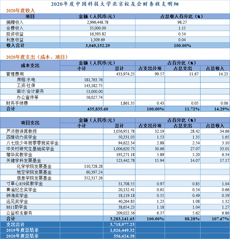 2020年,中国科技大学北京校友会(以下简称北京校友会)收到捐赠共计 2,996,448.78元(人民币,下同)、会费收入 35,000.00元、投资收入 16,393.82元、利息收入 1,309.69元。北京校友会感谢校友对母校与北京校友会的支持,现践行财务公开原则,现向各捐赠校友通报2020年北京校友会捐赠收入及项目支出情况(尚未经审计最终确认)。