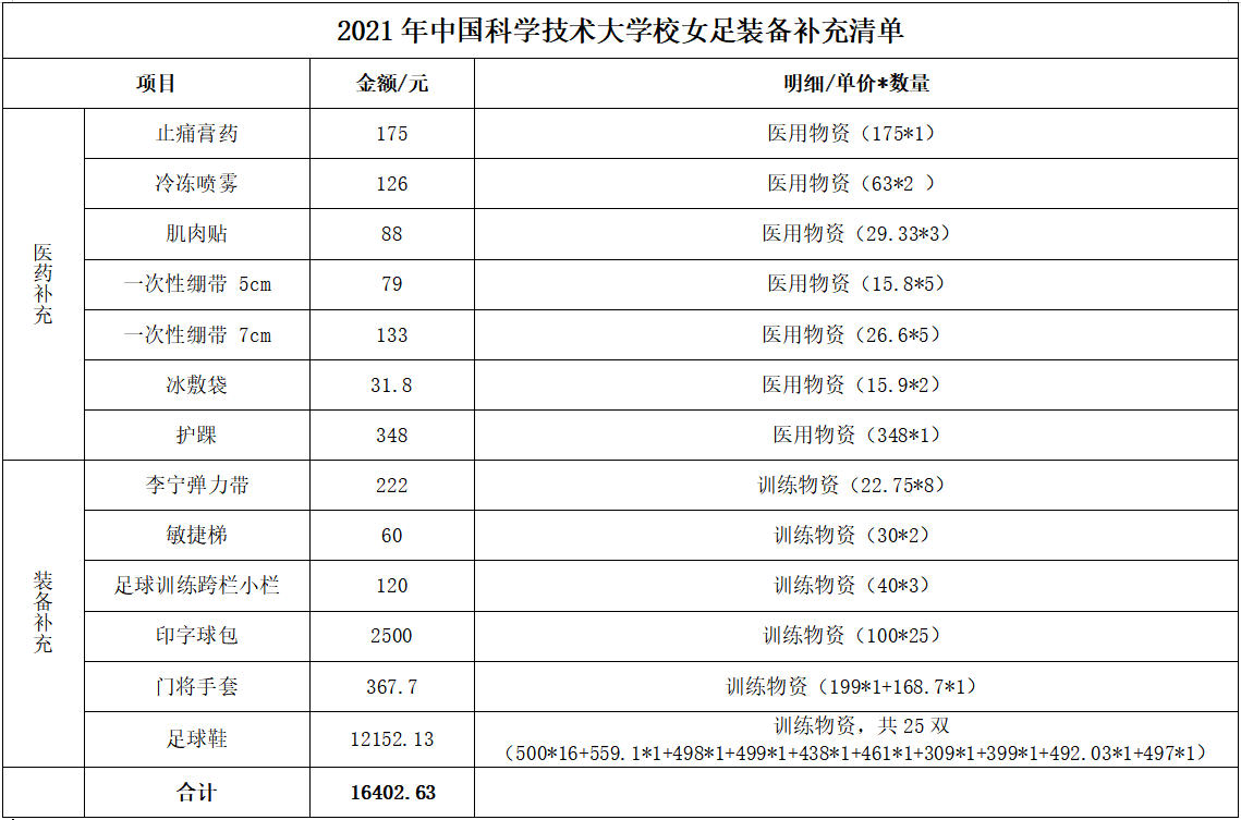 因2020年以前校友捐赠的部分装备已随大部分老队员离队不便回收(绝大部分为个人消耗品球鞋球衣等)。2021年中国科大女足物资费用由新创校园文化与体育基金分两次报销,共报销16402.63元。新创基金会承诺财务公开,也期待能有捐赠补充,确保对其他项目的支持。