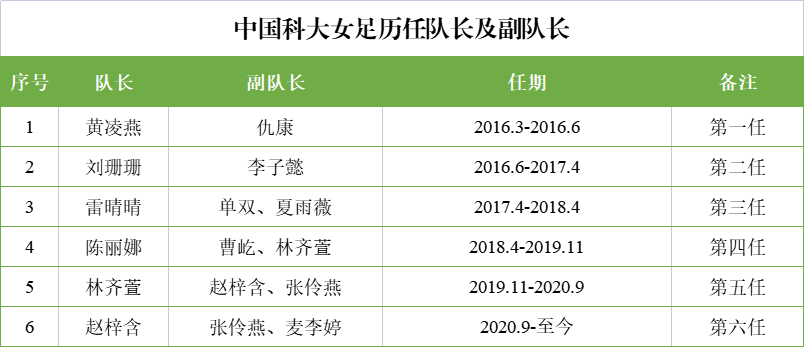 女足校队成立至今,在6任队长及副队带领下逐渐成长为一个相互信任、感情深厚的集体。第三任队长雷晴晴还被众队员冠以“衩队”称号并延传至今(编者注:该称号源于2016年省赛,队员们在一起复盘比赛视频时的调侃),提到自己成为女足队长的原因,“衩队”则说:“我是一路跟着校队成长的,对球队感情比较深,还有队友对我的信任。接任队长前,我更多的还是一个替补门将,技术、意识方方面面还不成熟,凭着对校队的热情和责任迫使自己快速成长起来。”